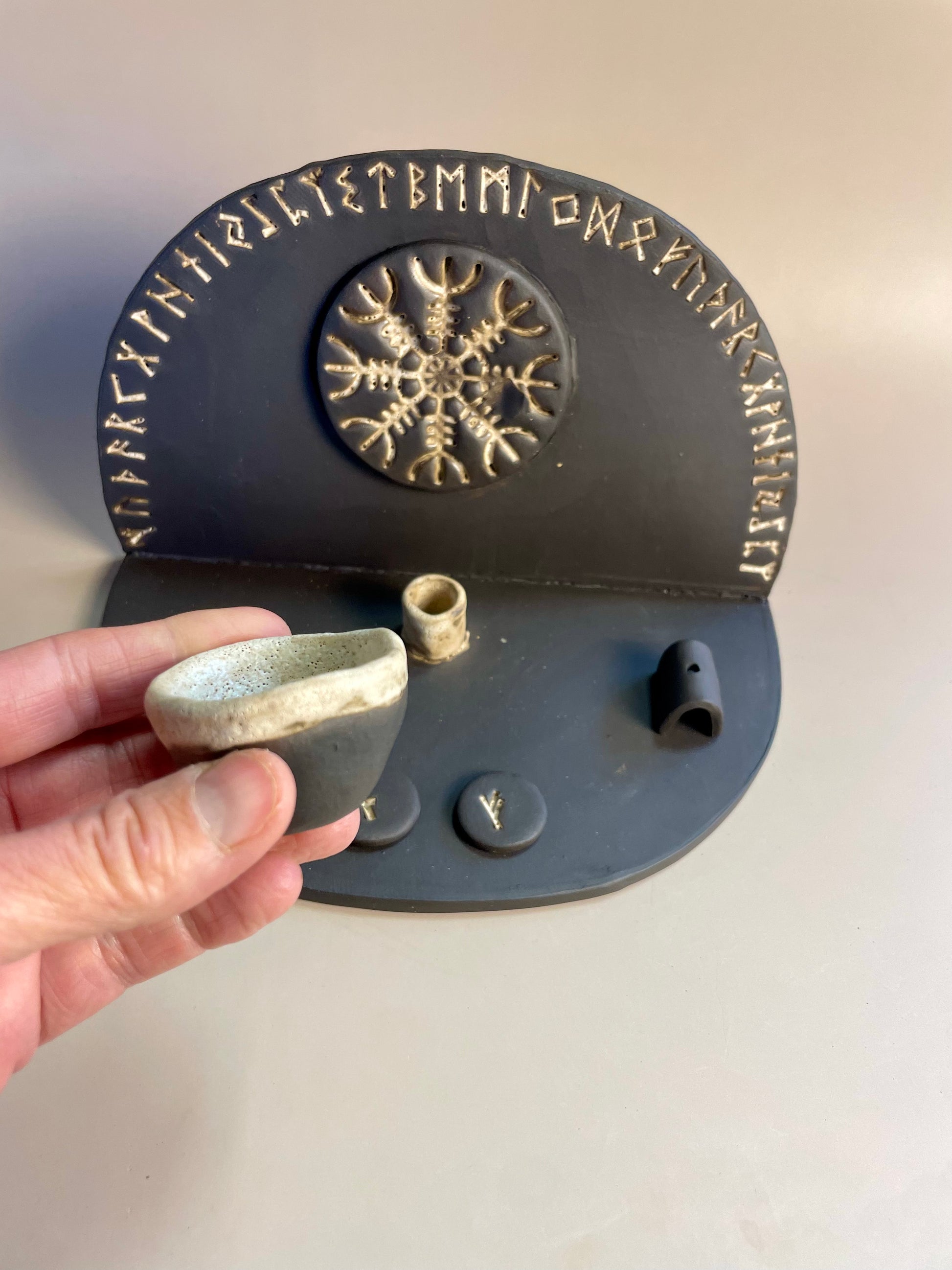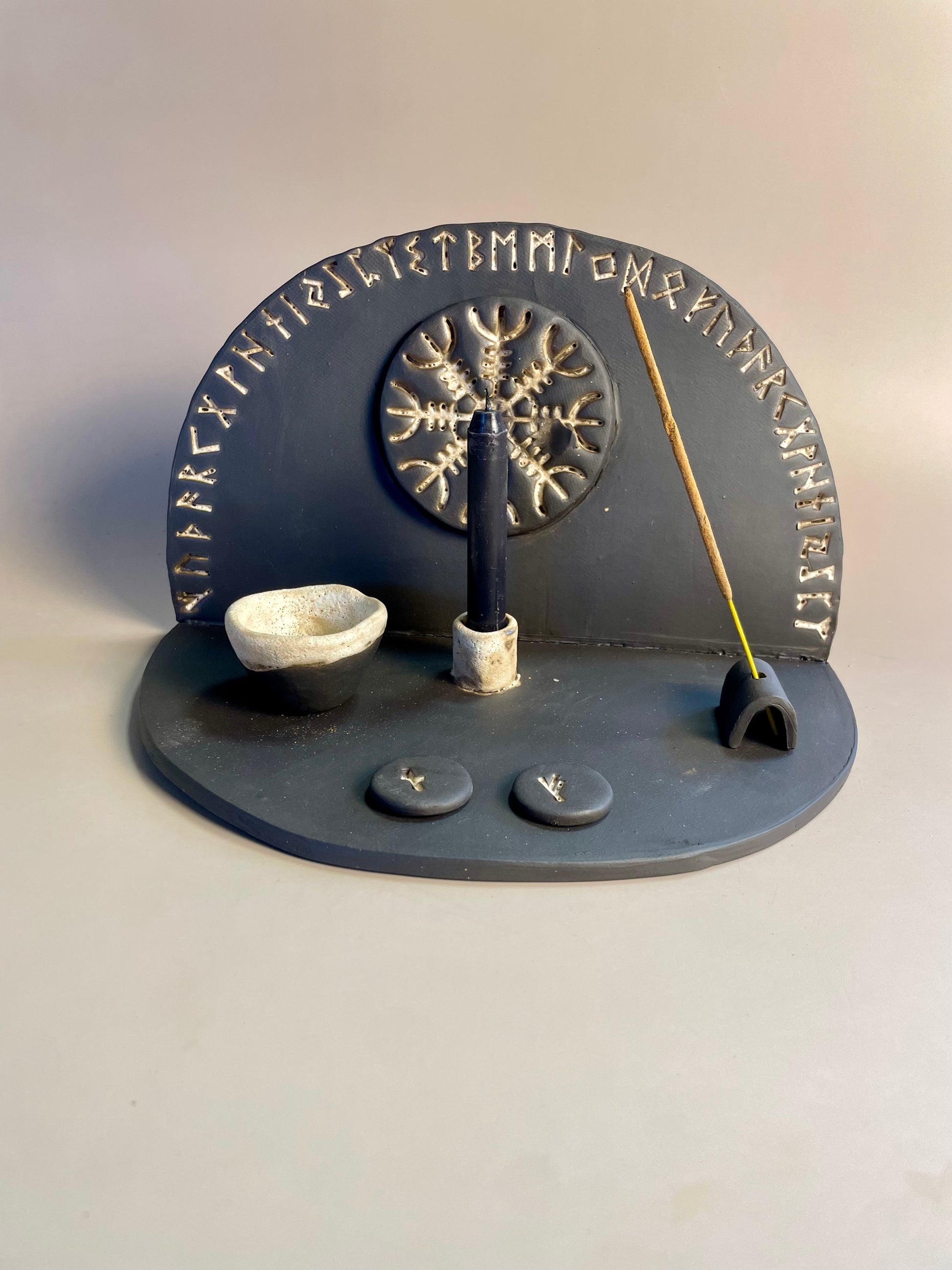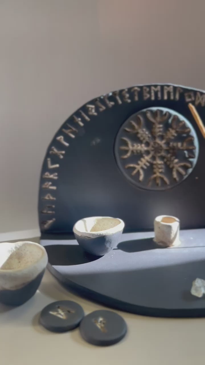 Handcrafted from dark clay, this altar is a fusion of ancient wisdom and modern spirituality. Featuring the Elder Futhark runes and the powerful Helm of Awe on the back, it’s a sacred space for your rituals and readings.