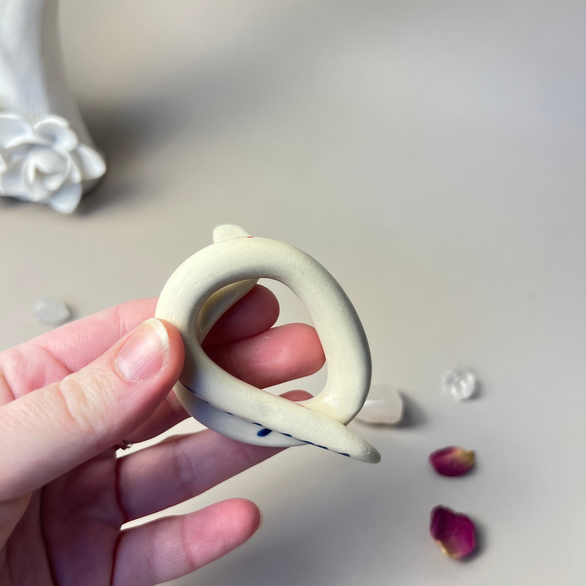 This adorable handmade snake ornament is both a charming decorative piece and a functional paperweight! Sculpted with care and hand-painted in vibrant blue and red hues, this cute ceramic snake adds a pop of personality to your desk, shelf, or table.