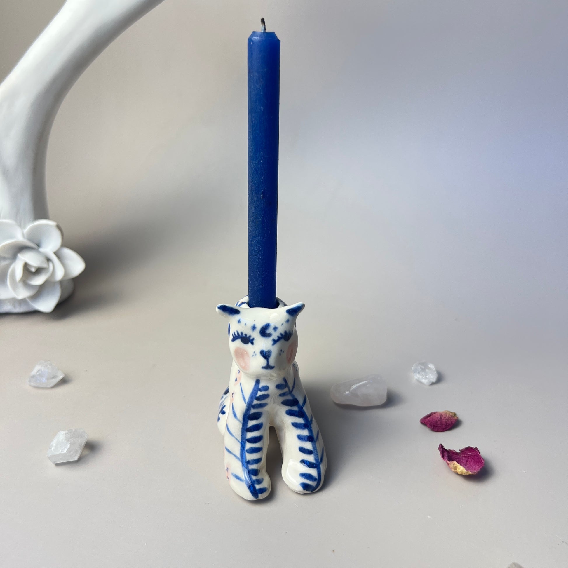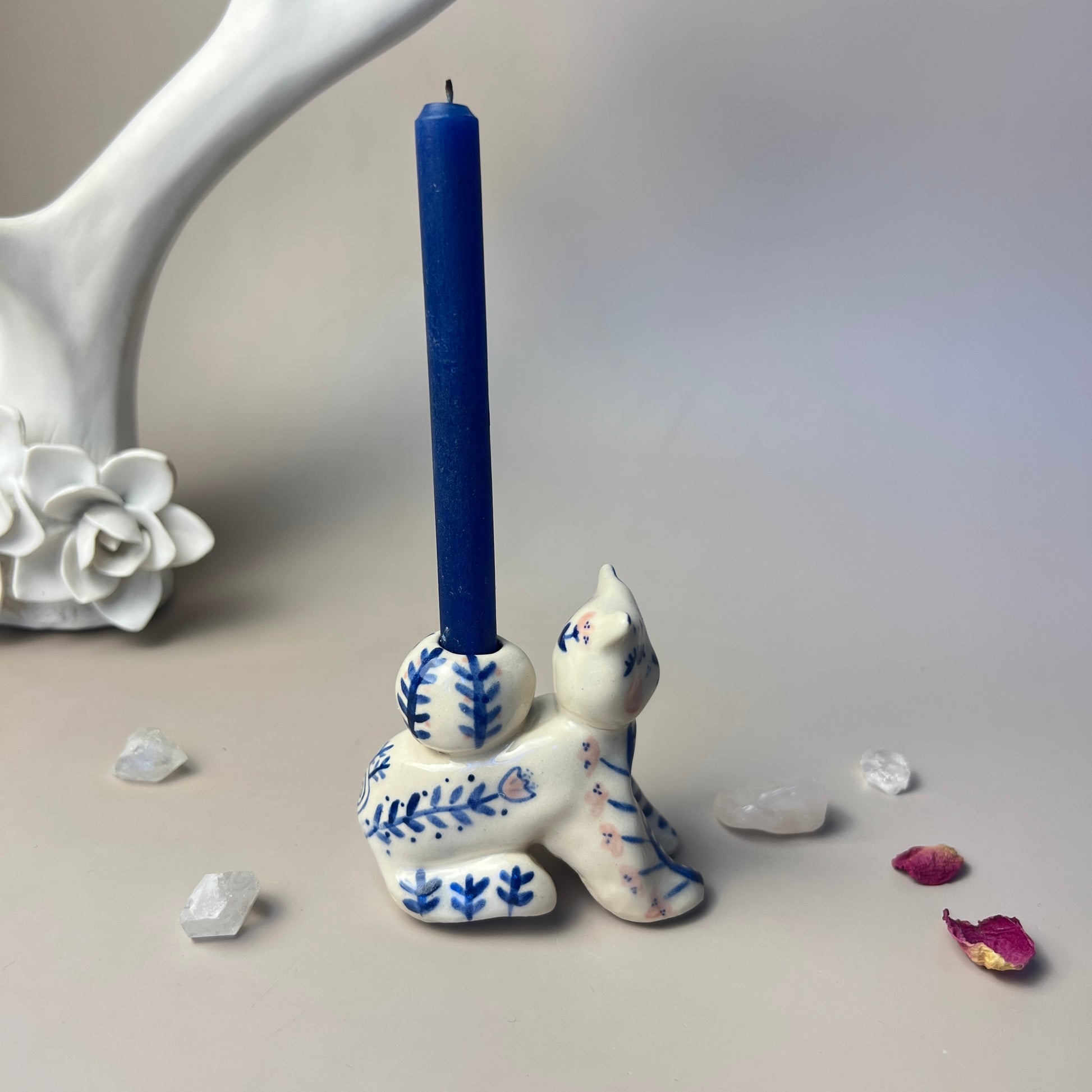 Bring a touch of charm and whimsy to your space with this hand-painted ceramic cat candlestick holder. Featuring delicate blue botanical details and sweet pink cheeks, this one-of-a-kind design is both playful and elegant. Perfect for holding your favorite taper candle, this feline friend will light up your altar, dining table, or cozy nook.