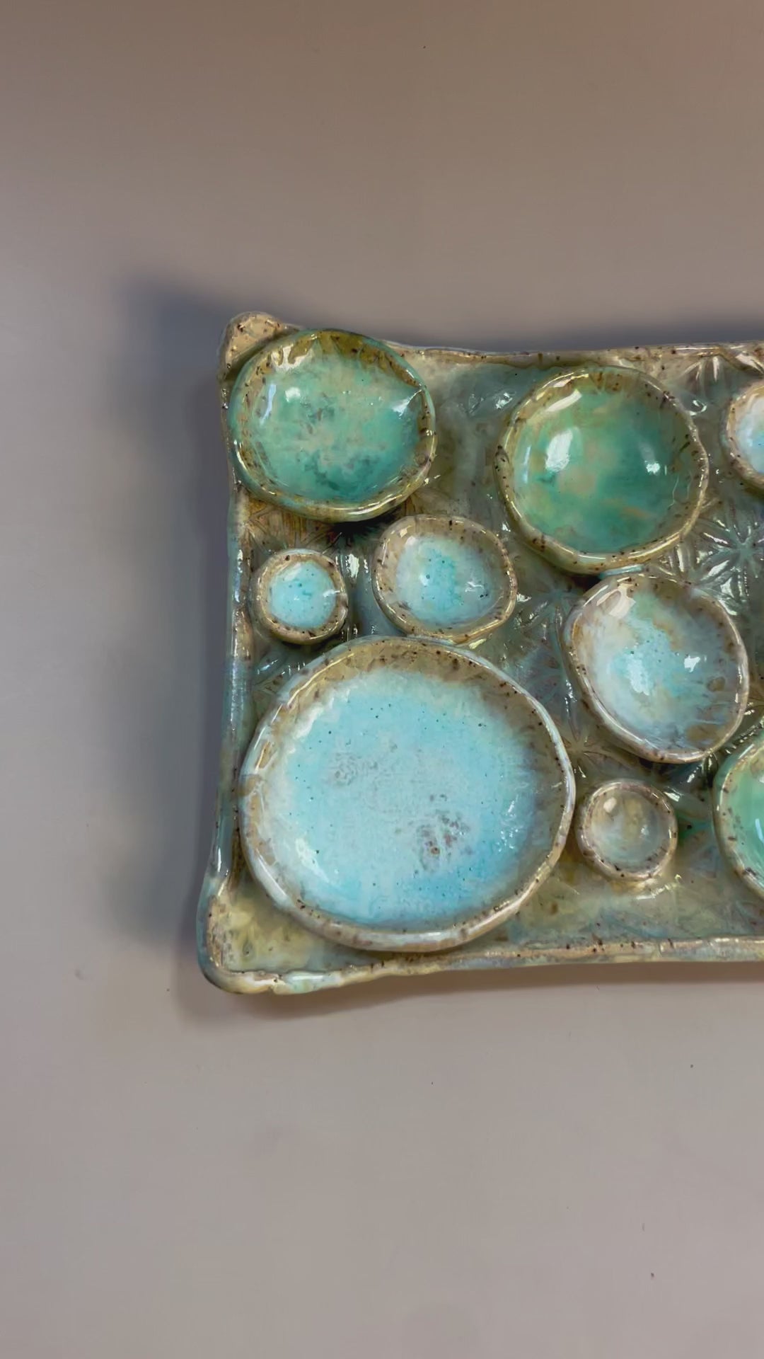 The tray is glazed in a luminous pearl white with hints of aqua and emerald green, creating a serene and elegant aesthetic. It boasts 20 small dishes attached in various sizes, ranging from 2 1/4" diameter to 3/4", ideal for placing and charging your favorite crystals.
